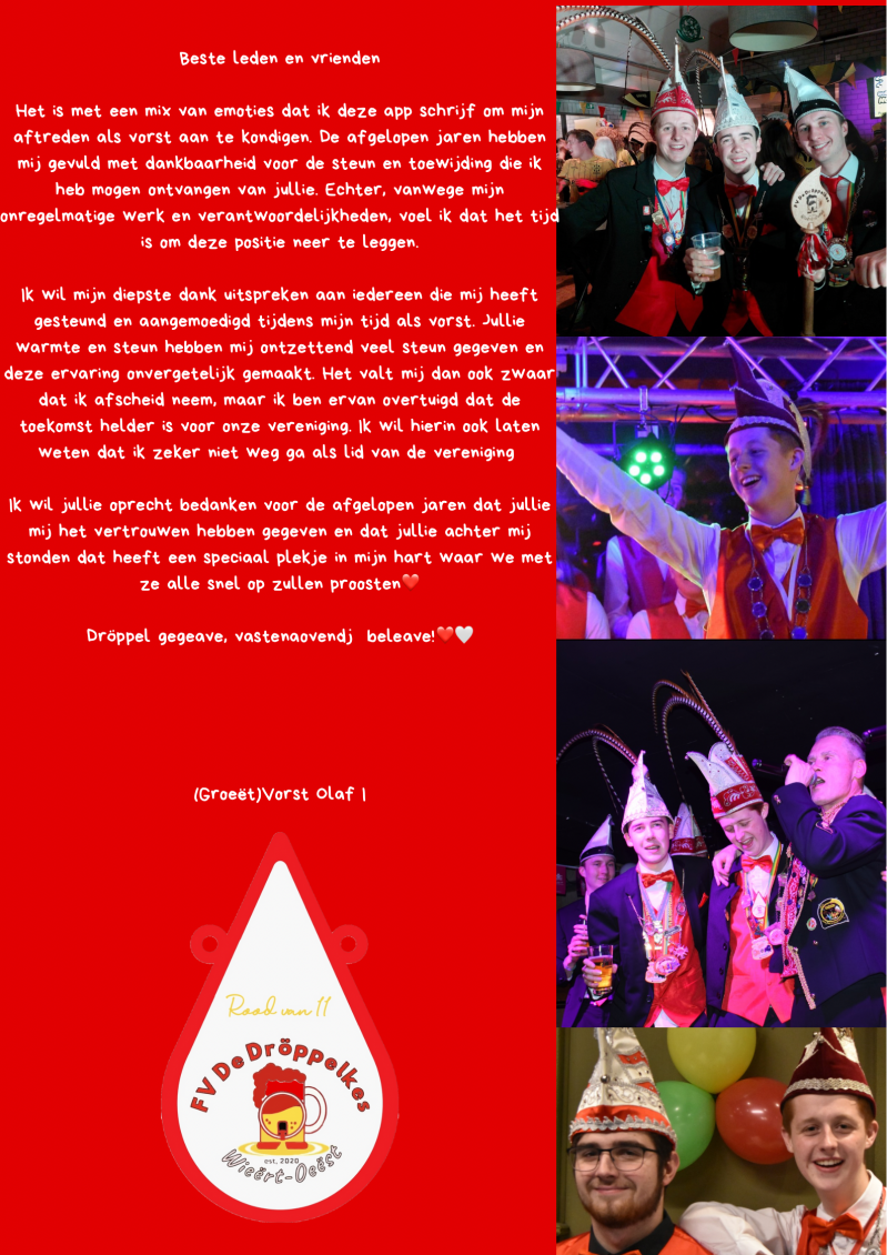Met ingangk van ‘t Vastelaovendjsezoen 2024/2025 zal F.V. De Dröppelkes unne noôwe Vorst gaon kriege. Nao 2 gewêldjige jaore hieët oeëze Vorst Olaf helaas zien taak as Vorst van de vereîniging nieët motte legge. Soms hejje momênte det ‘t werk toch ff vuuër gieët, en zieëker in de belangrieëke veiligheids-sector. Vorst Olaf is nao zien 2 jaore as Vorst dan aug unaniem beneûmdj tot Groeëtvorst vanne Vereîniging! ❤️🤍